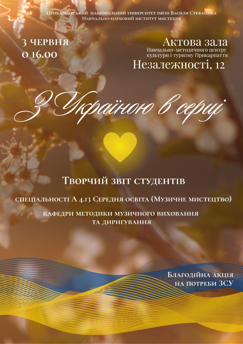 3 червня в актовій залі Обласного науково-методичного центру культури Прикарпаття відбувся звітний концерт студентів кафедри методики музичного виховання та диригування з промовистою назвою “З Україною в серці”.