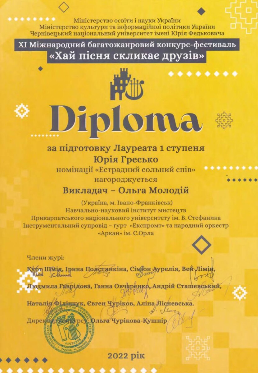 - лауреат І премії ХІ Міжнародного вокально-хорового конкурсу-фестивалю «Хай пісня скликає друзів»,Чернівецький національний університет імені Юрія Федьковича, травень 2022 р.