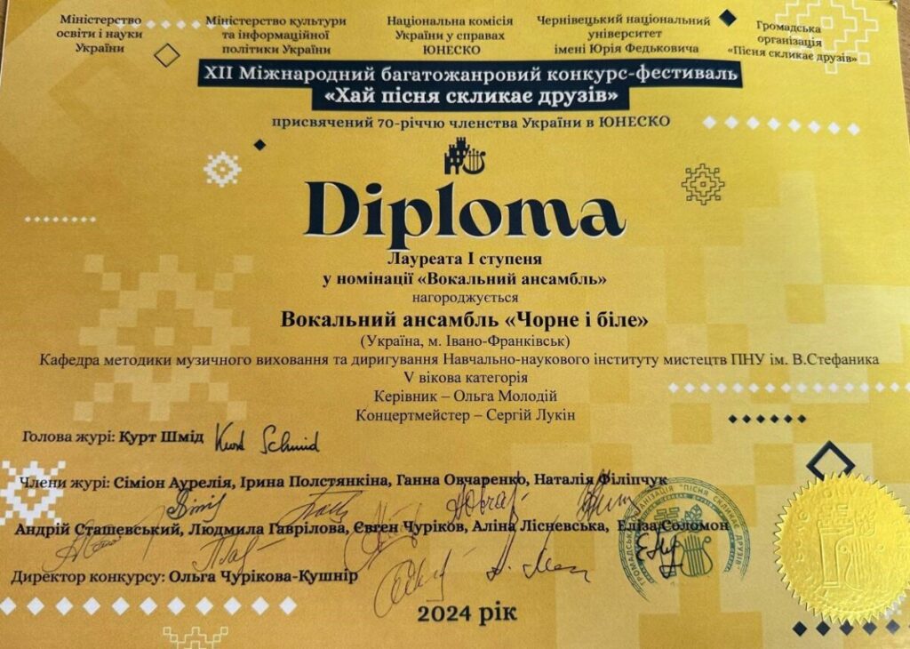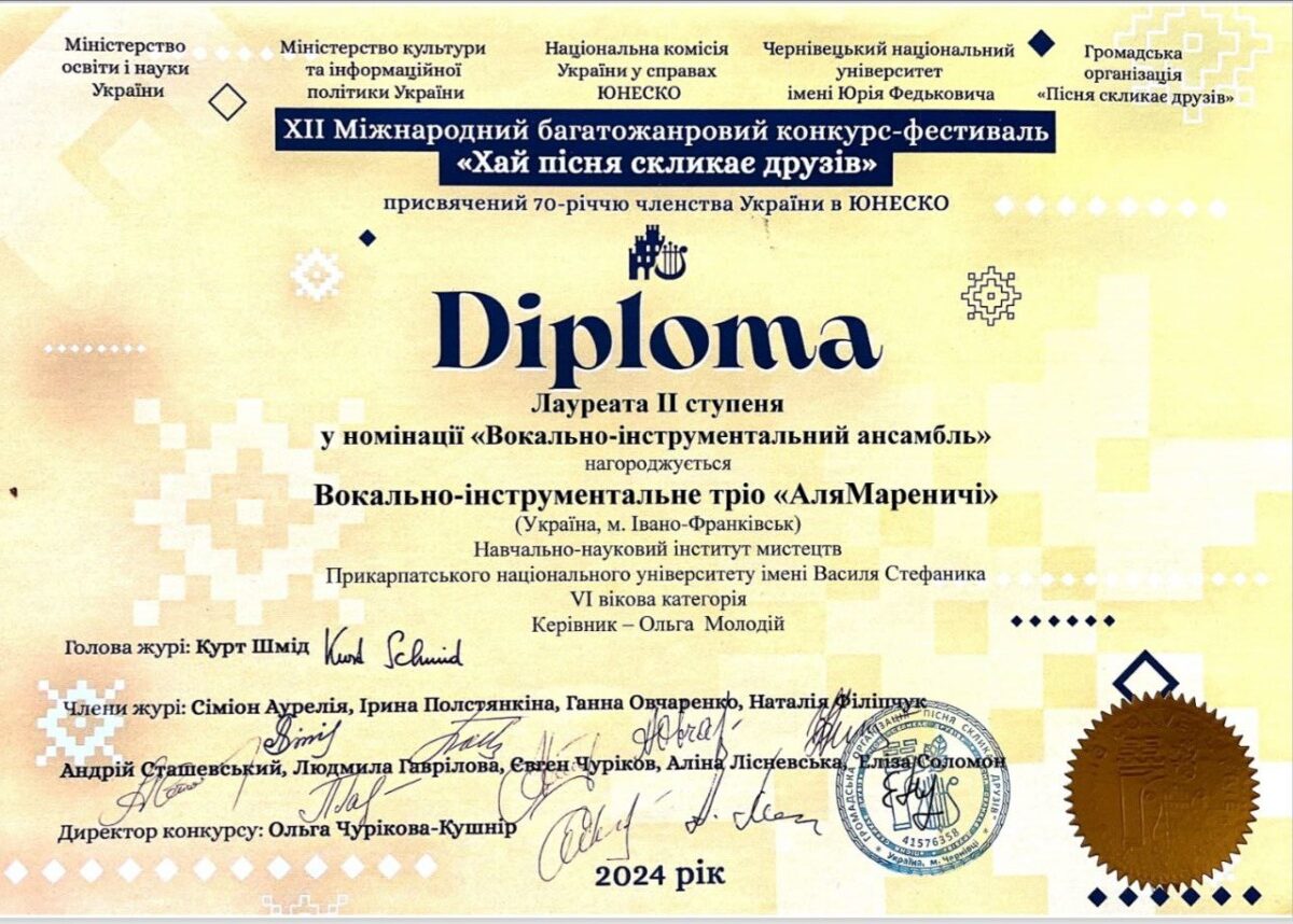 ІІ місце на ХІІ Міжнародному багатожанровому конкурсі-фестивалі «Хай пісня скликає друзів» (Чернівці, травень 2024р.);