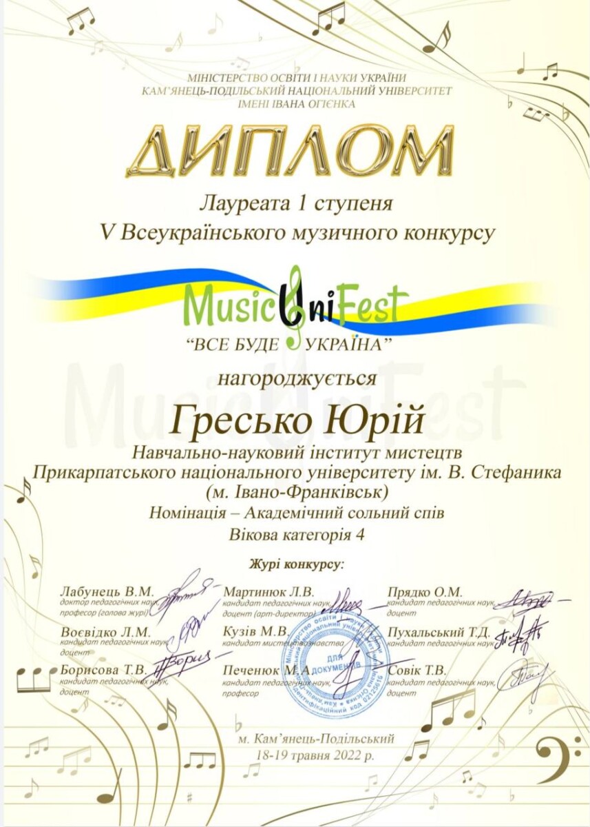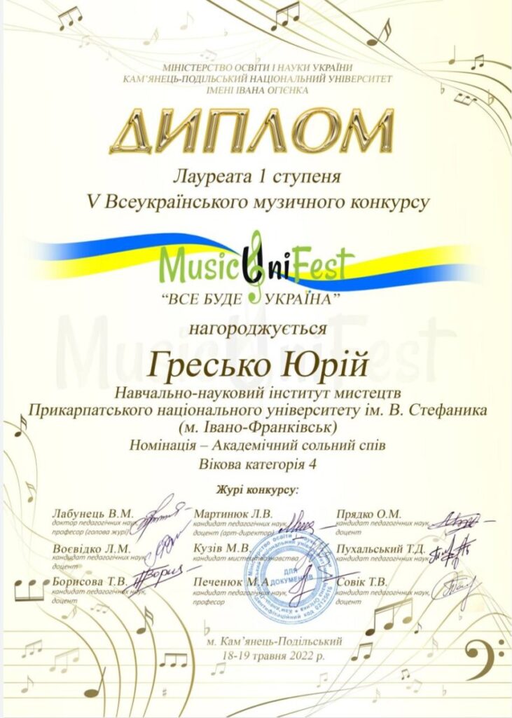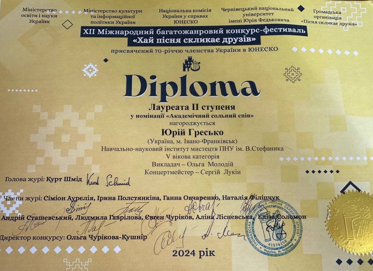 Вокальний дует у складі Юрія Греська та Івана Маснюка (клас доцента Молодій О.Р.) – лауреат І премії ХІІІ-го Міжнародного багатожанрового конкурсу-фестивалю «Хай пісня скликає друзів» (Чернівці, травень 2025 р.)