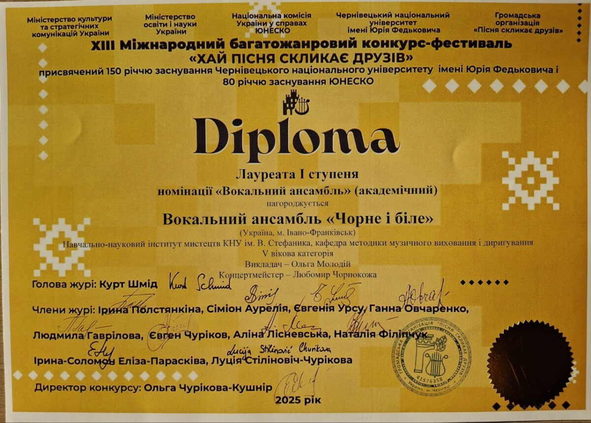 - І місце на ХІІІ Міжнародному багатожанровому конкурсі-фестивалі «Хай пісня скликає друзів» (Чернівці, травень 2025 р.)