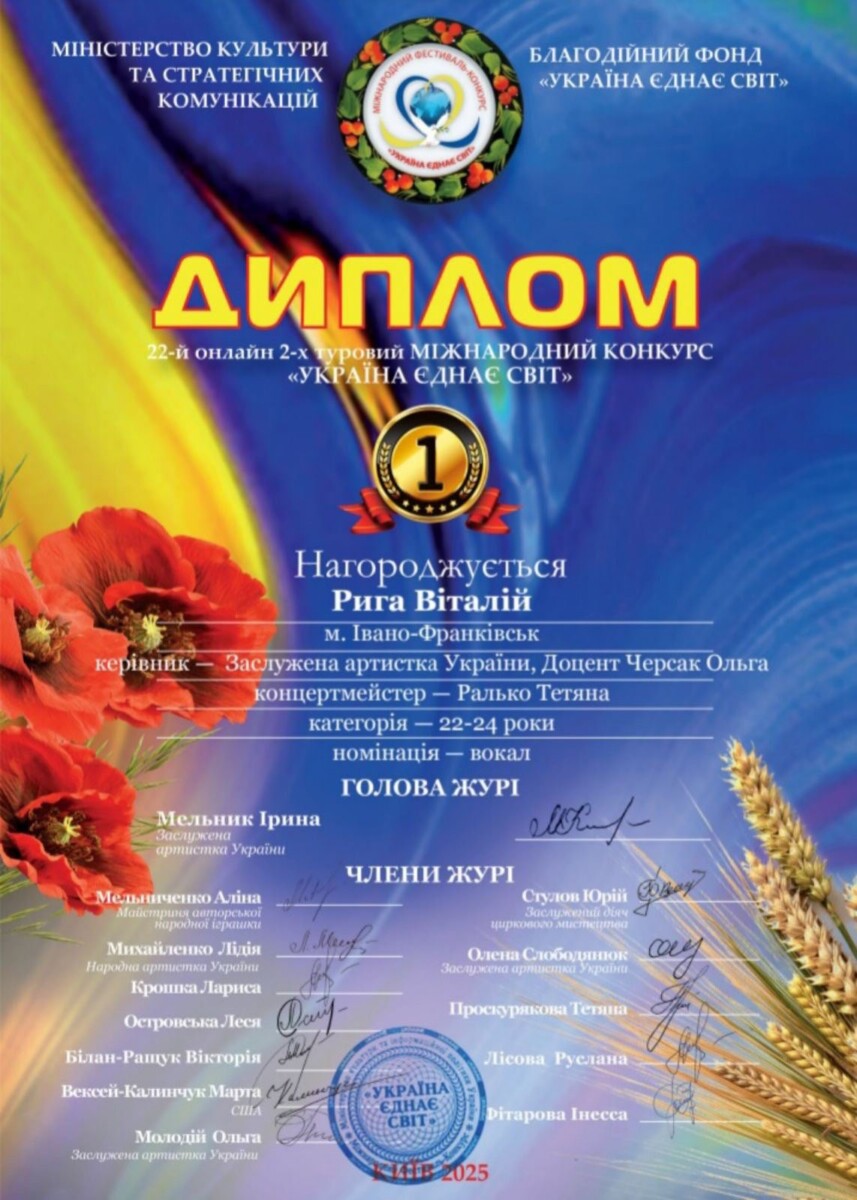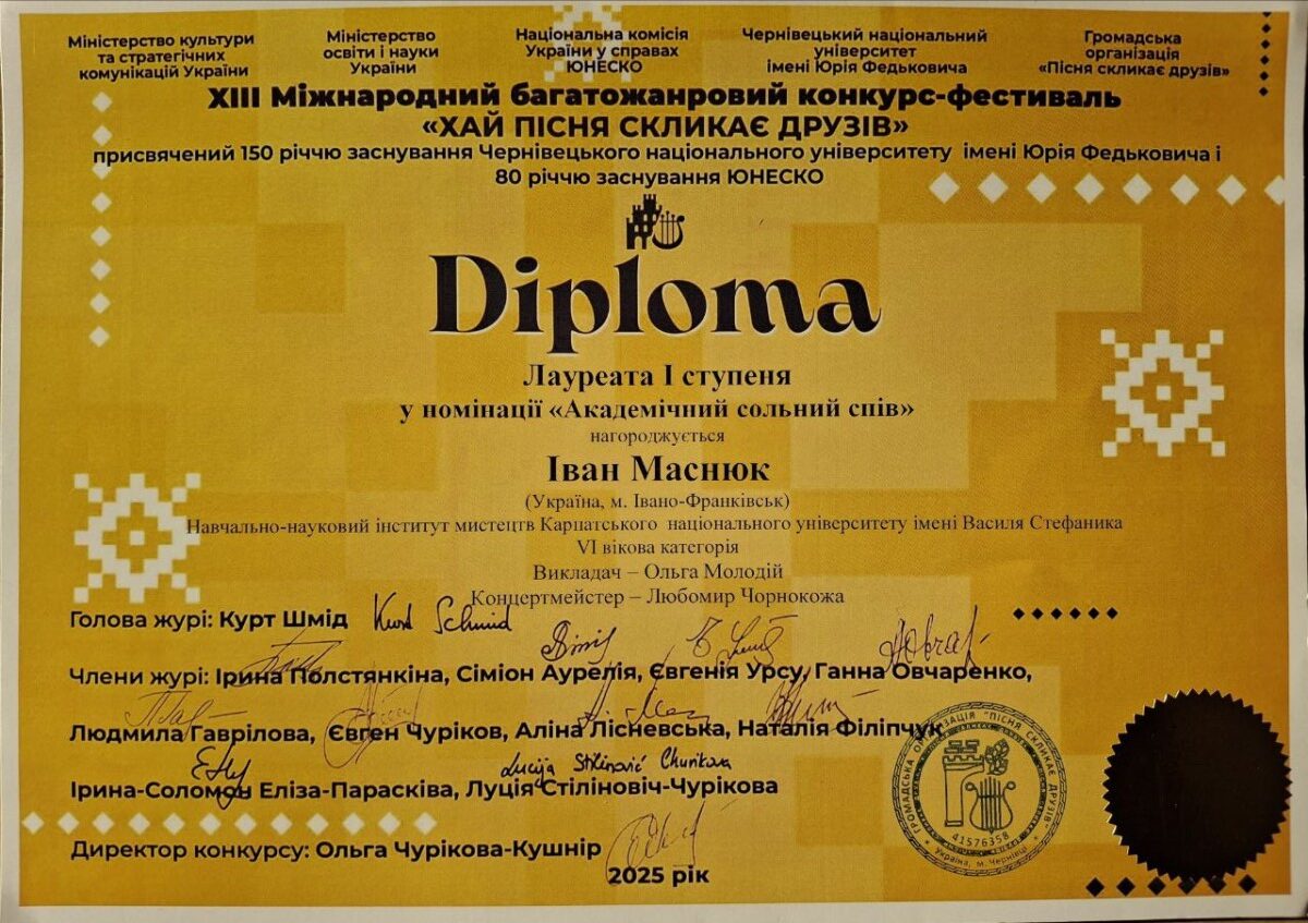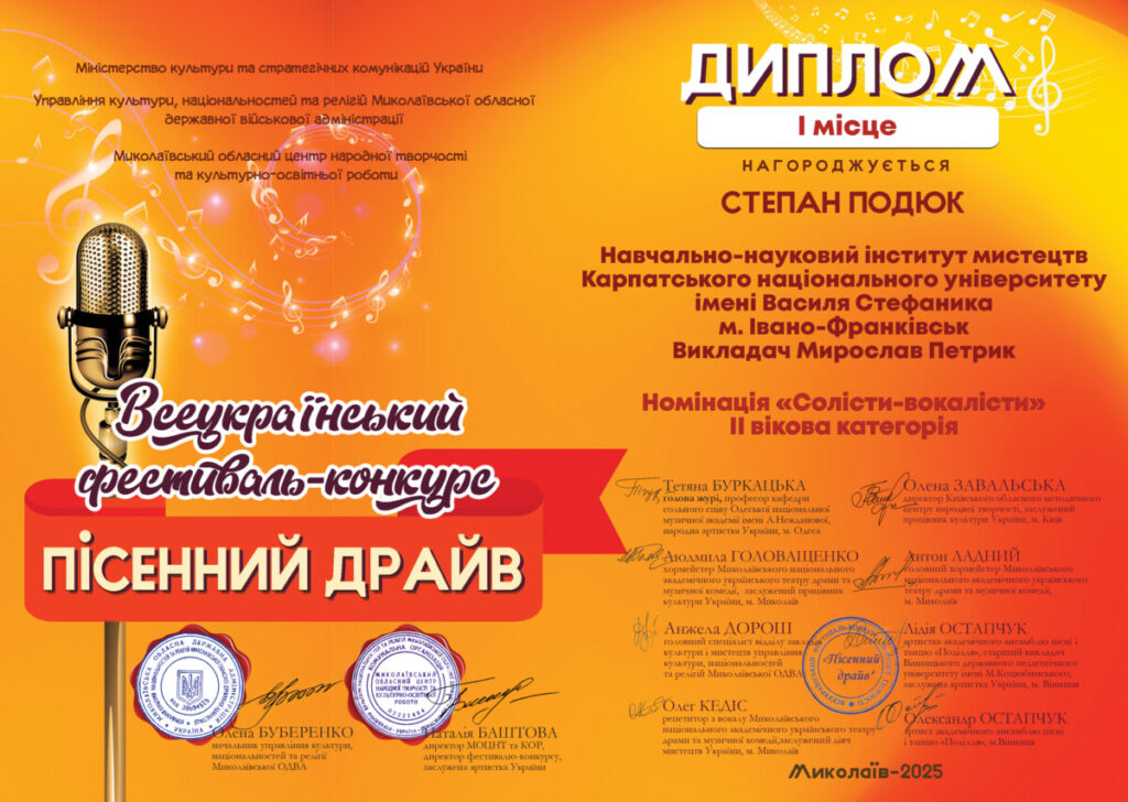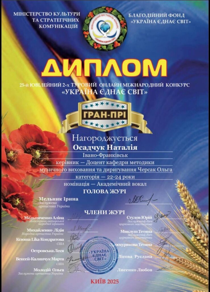 - ГРАН-ПРІ ІІІ Міжнародного двотурового благодійного фестивалю-конкурсу вокалістів «Співай» (Чернівці, лютий 2025 р.)