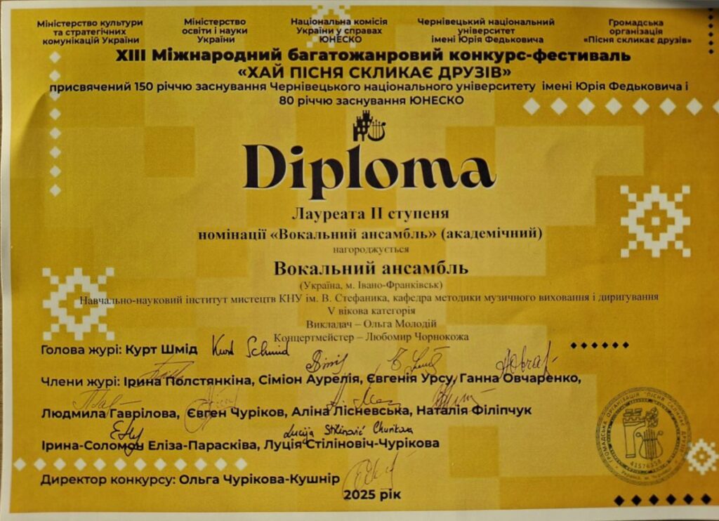 - ІІ місце на ХІІІ Міжнародному багатожанровому конкурсі-фестивалі «Хай пісня скликає друзів» (Чернівці, травень 2025 р.);