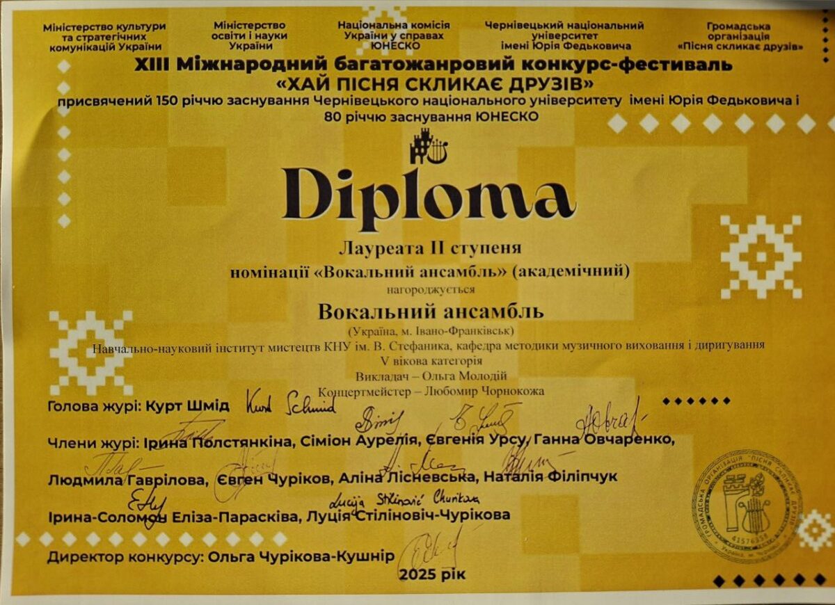 Наталія Коновалова (клас доцента Молодій О.Р.) – лауреат ІІ премії ХІІІ-го Міжнародного багатожанрового конкурсу-фестивалю «Хай пісня скликає друзів» (Чернівці, травень 2025р.)