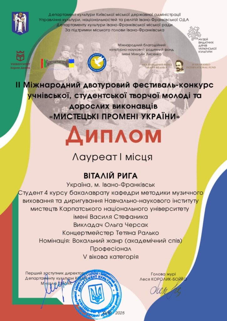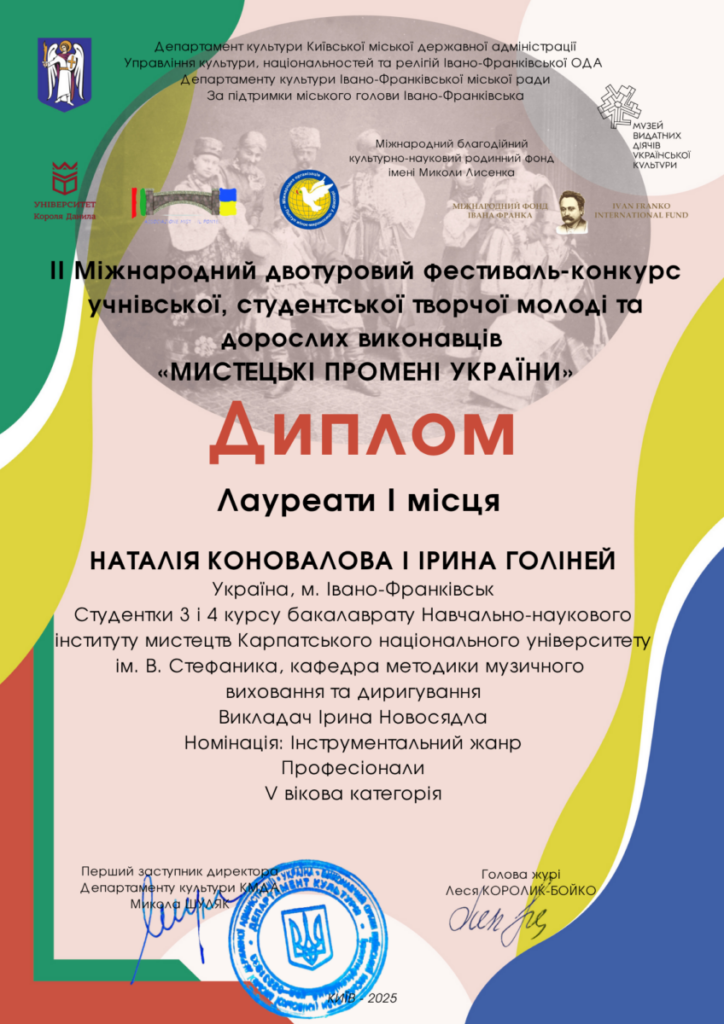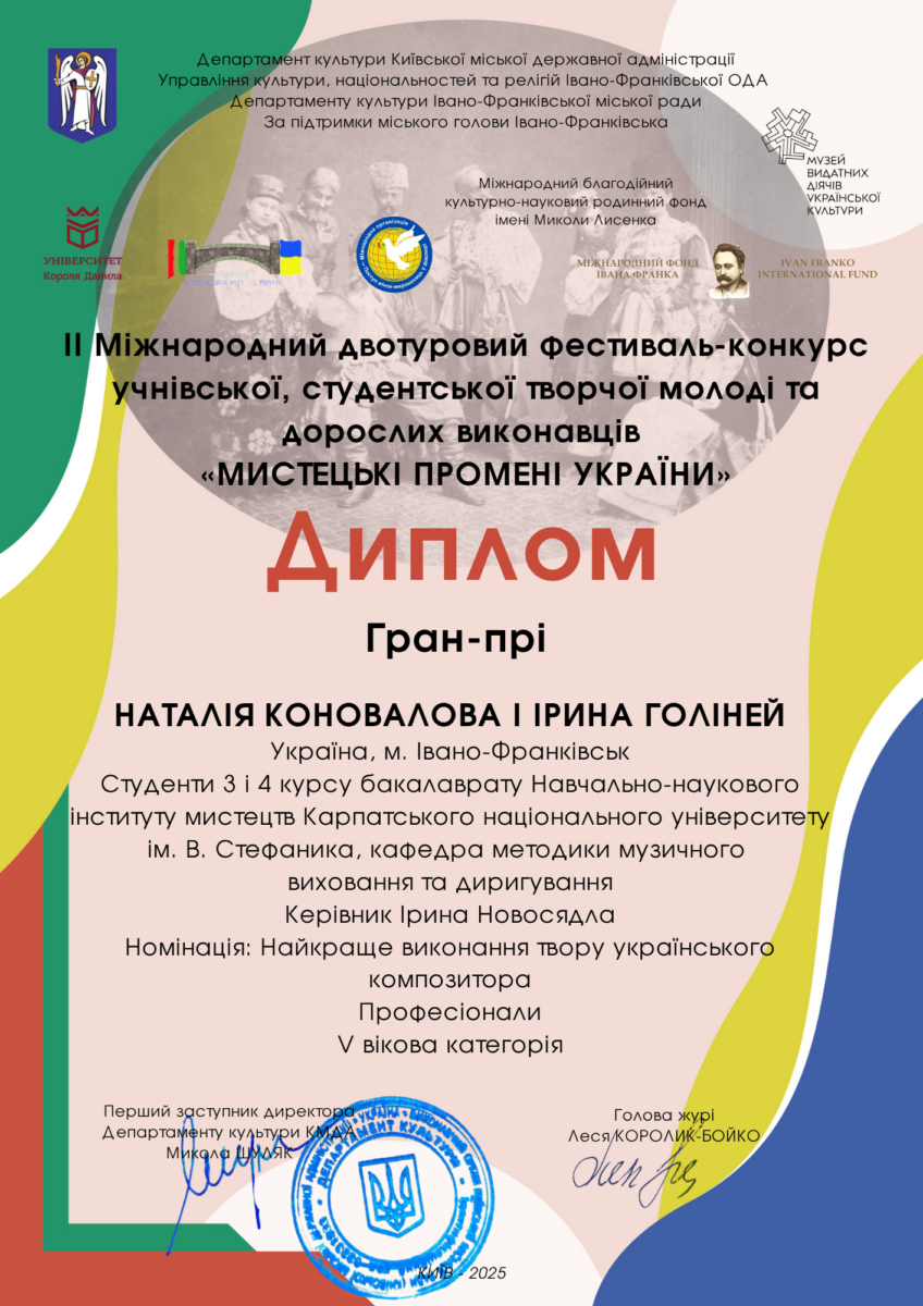 - ГРАН-ПРІ ІІ Міжнародного фестивалю-конкурсу «Мистецькі промені України» (Івано-Франківськ – Київ, вересень-жовтень 2025 р.)