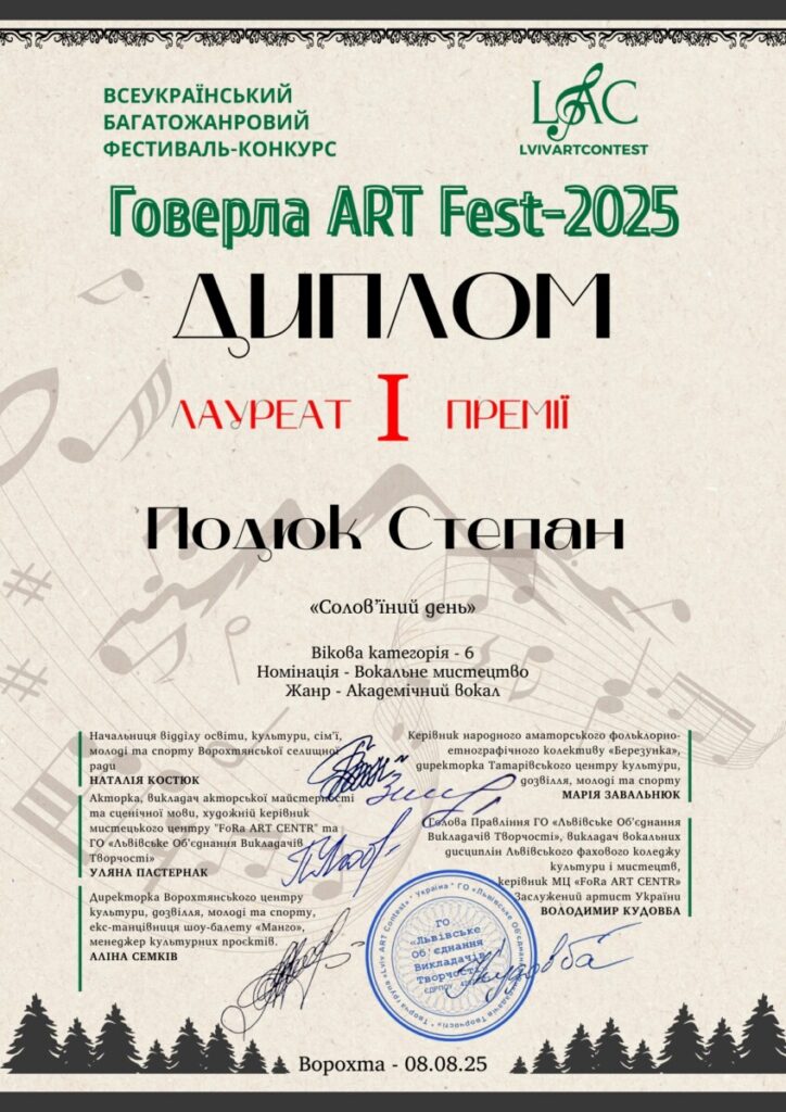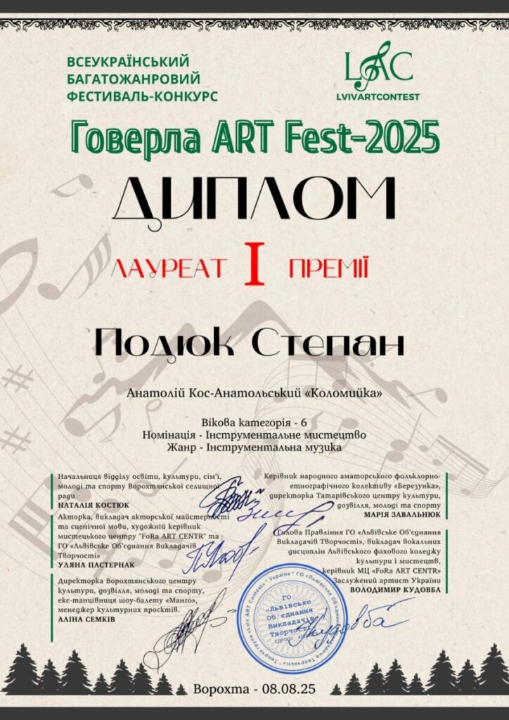 - лауреат І премії багатожанрового фестивалю-конкурсу “Говерла ART-FEST-2025” (номінація “Інструментальне мистецтво”, VI вікова категорія) – 08.08.2025, Ворохта