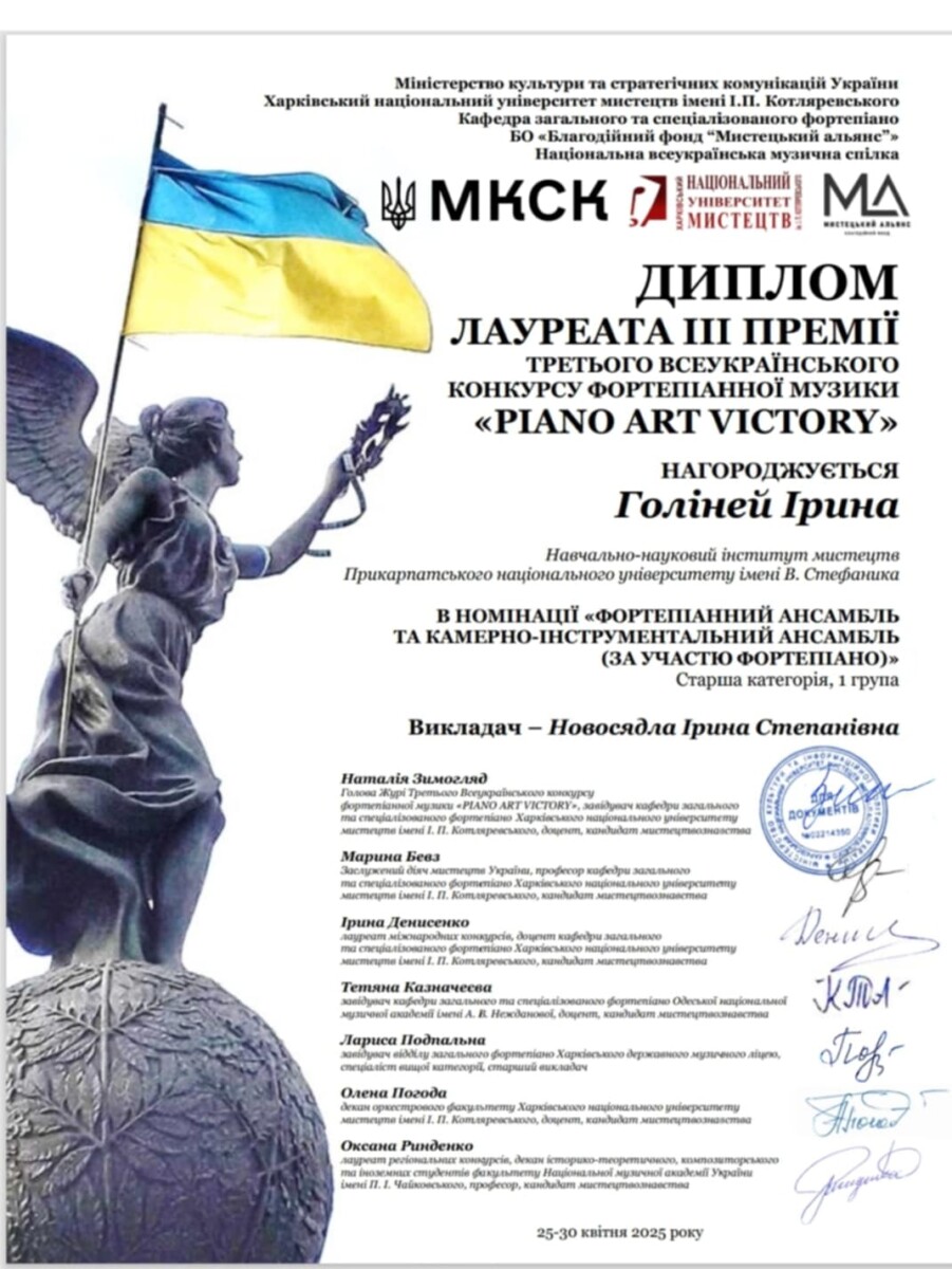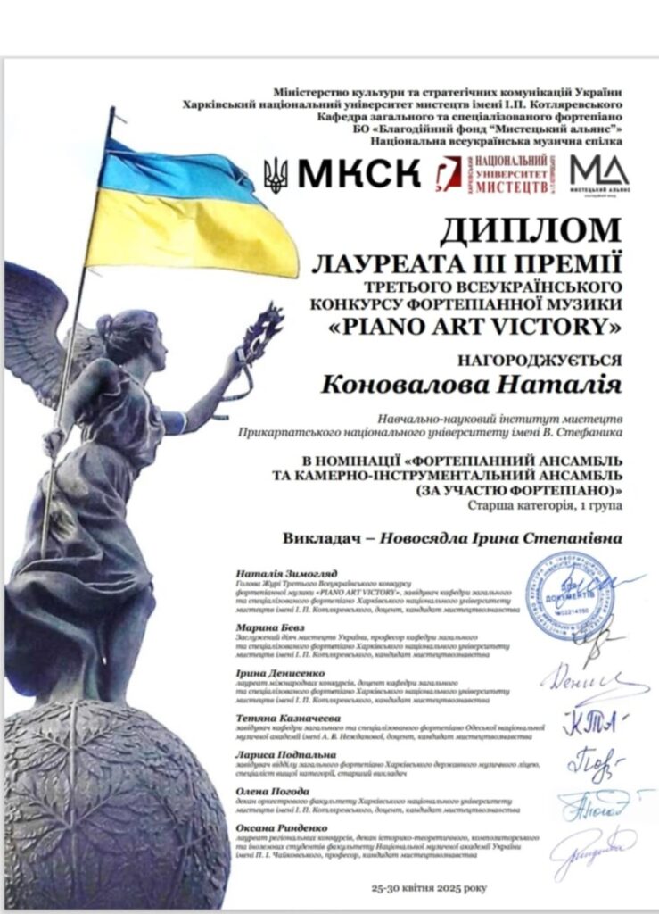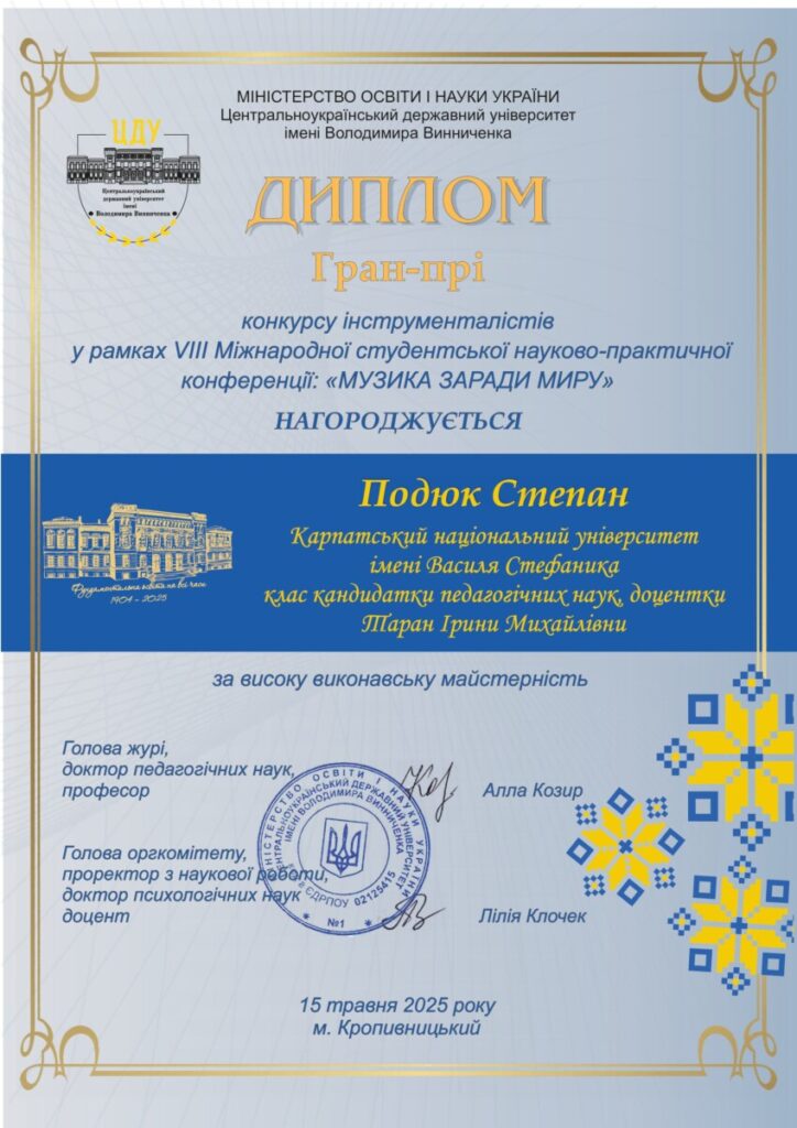 - ГРАН-ПРІ конкурсу інструменталістів в рамках VII Міжнародної студентської науково-практичної конференції “Музика заради миру” (15.05.2025, м. Кропивницький)