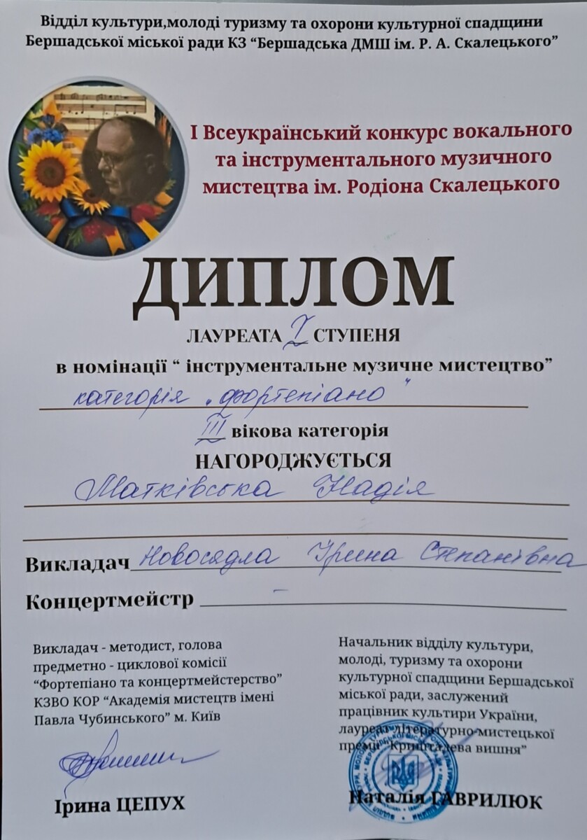 лауреат І ступеня в номінації “Інструментальне музичне мистецтво, категорія “фортепіано”” на І-му Всеукраїнському конкурсі вокального та інструментального музичного мистецтва ім. Р. Скалецького (22– 23.11.2025 р., Вінниця)