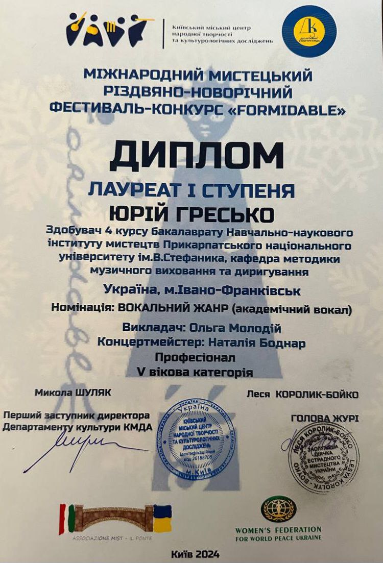 - лауреат XVIМіжнародного конкурсу “Україна єднає світ”, в номінації Академічний вокал, Київ,2024.