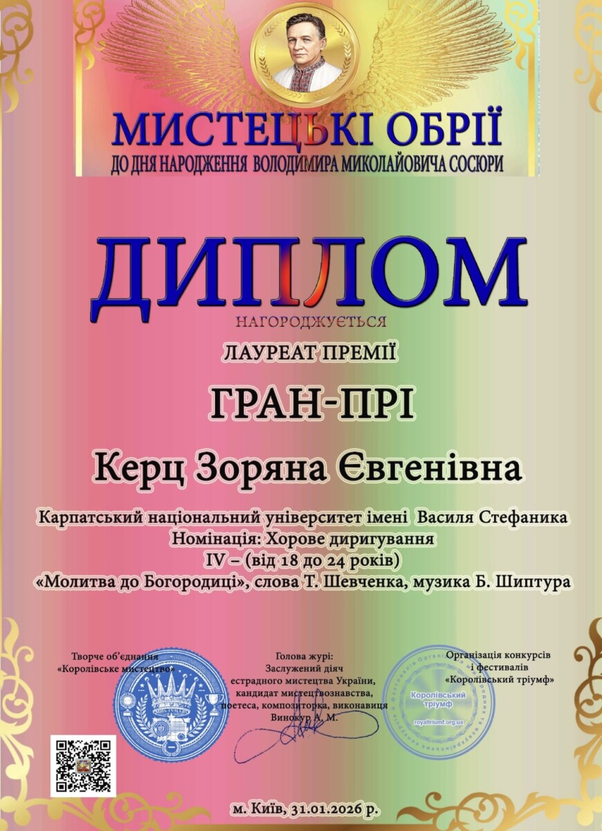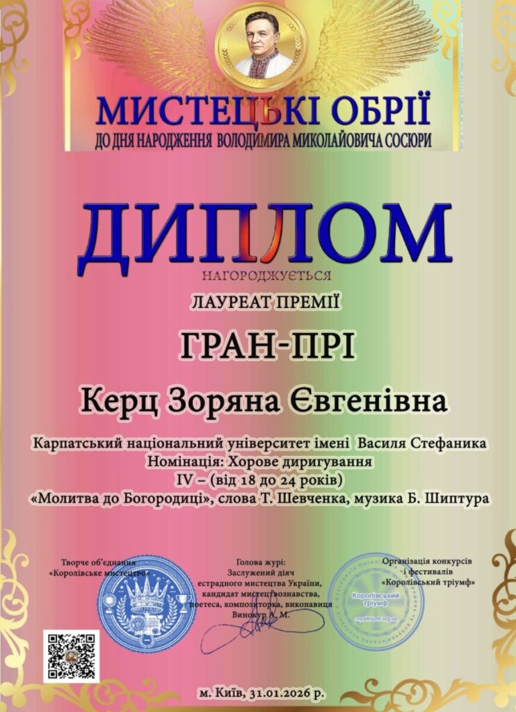 - ГРАН ПРІ конкурсу “Мистецькі обрії” (номінація “Хорове диригування”, IV вікова категорія), м. Київ, 2026 рік