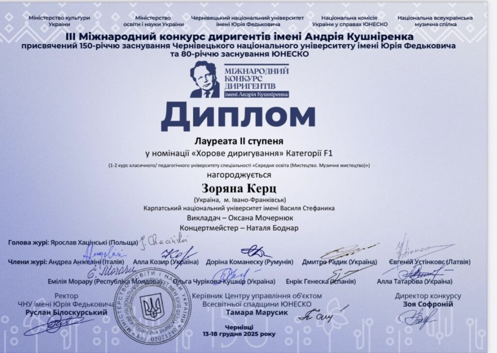 - лауреат І ступеня в Міжнародному конкурсі диригентів імені Андрія Кушніренка (номінація “хорове диригування”, категорія F2), м. Чернівці, 2025 р.