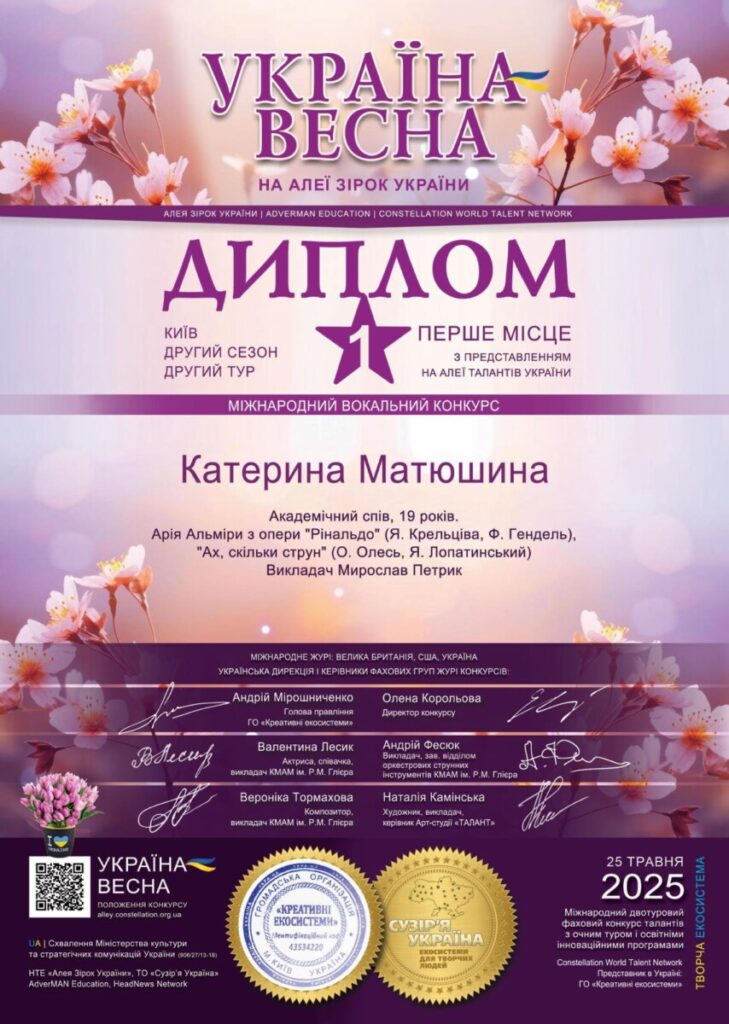 - лауреат Міжнародного вокального конкурсу “УКРАЇНА – ВЕСНА” (1 місце з представленням на алеї талантів України) в номінації Академічний спів, 25 травня, 2025.