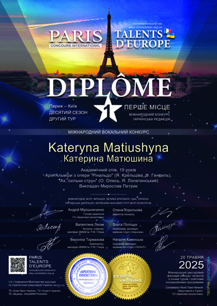 - лауреат Міжнародного вокального конкурсу “PARIS TALENTS D`EUROPE” (1 місце) в номінації Академічний спів, Париж – Київ, 20 травня 2025.