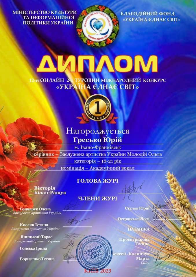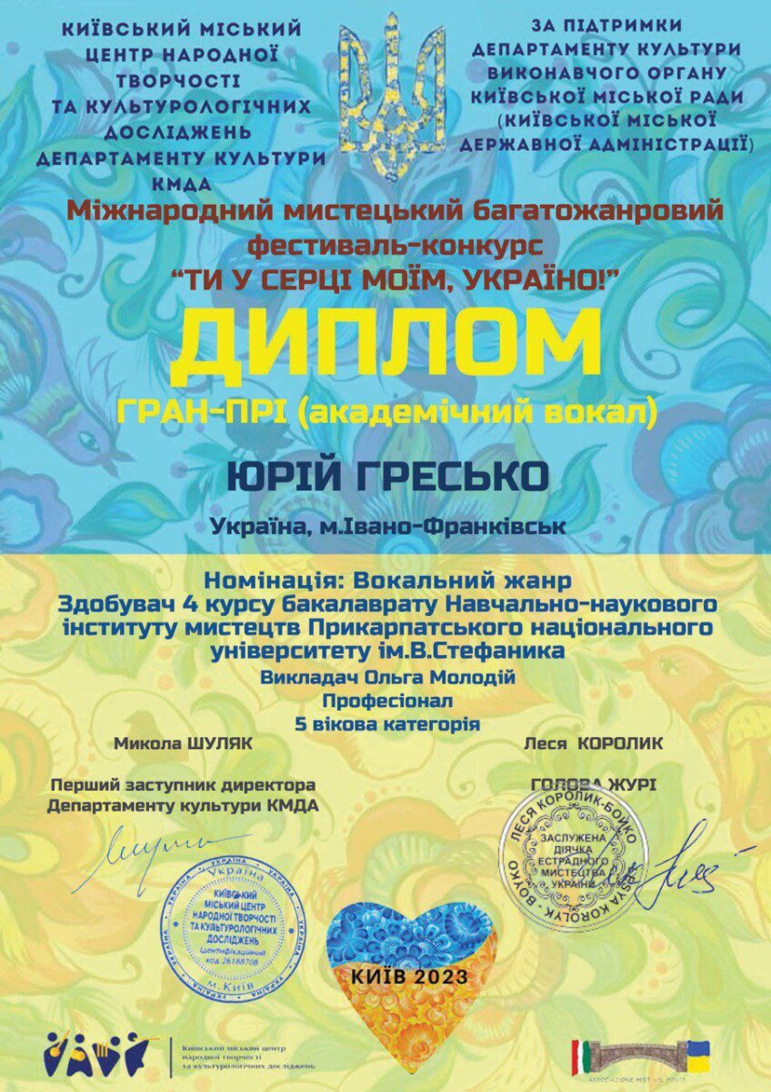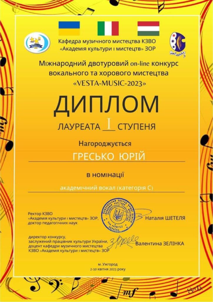 - ГРАН ПРІ Міжнародного двотурового on-line конкурсу вокального та хорового мистецтва «VESTA -MUSIC 2023». (Ужгород, квітень 2023 р.)